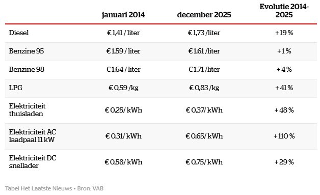 VAB wijst met de vinger naar de evolutie van de energiekost, zoals onderstaande tabel aantoont.